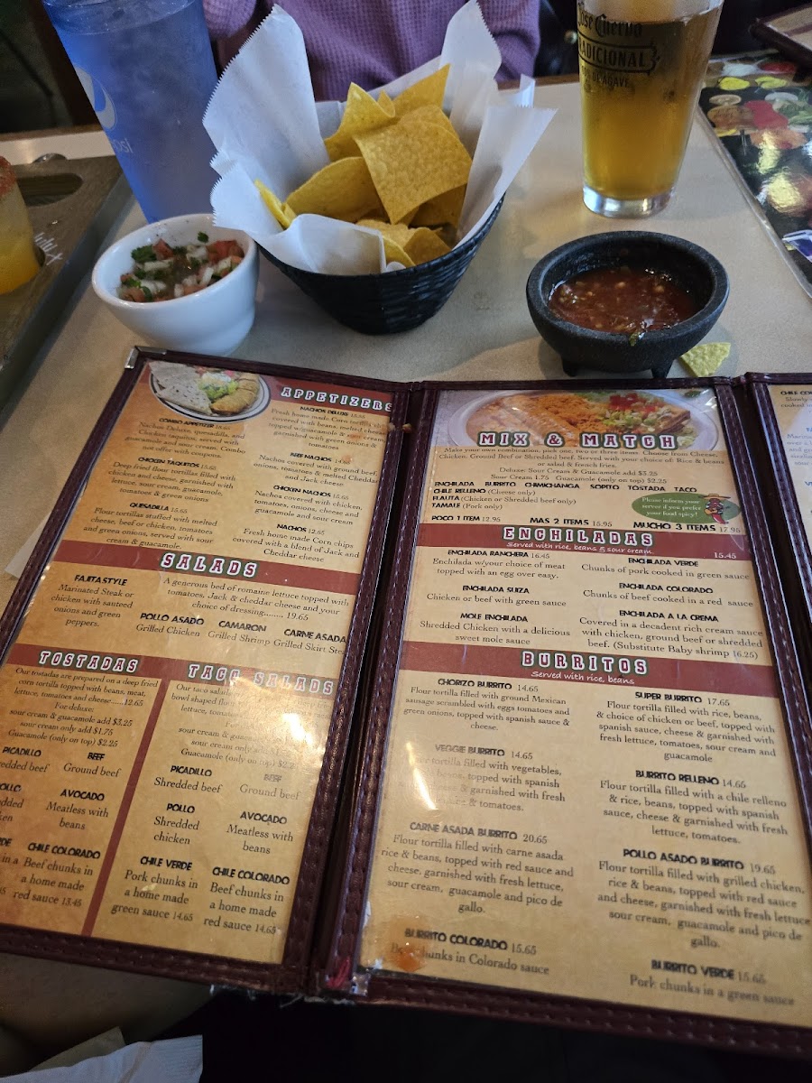 Beef chunks in Colorado sauce. Served with rice, beans