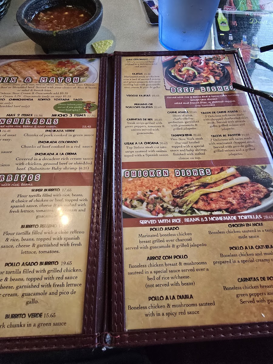 Boneless chicken breast & mushrooms sauteed in a special sauce served over a bed of rice w/cheese. (not served with beans). Served with rice, beans & 3 homemade tortillas.
