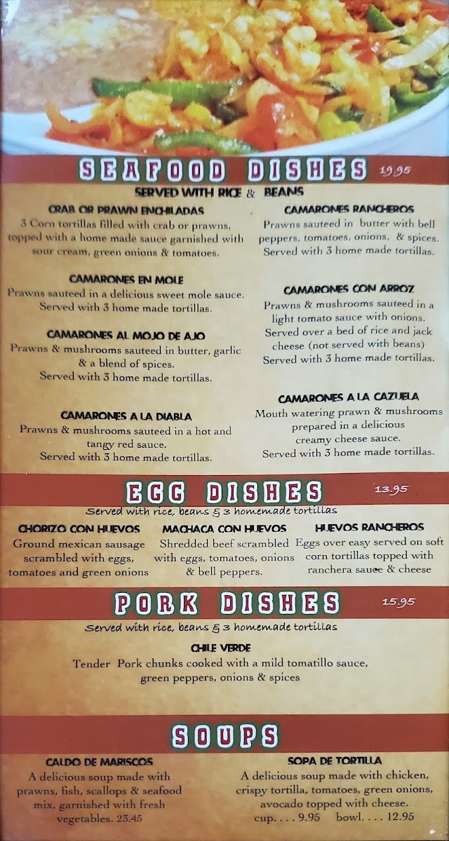 Prawns & mushrooms sauteed in a light tomato sauce with onions. Served over a bed of rice and jack cheese (not served with beans) Served with 3 home made tortillas.