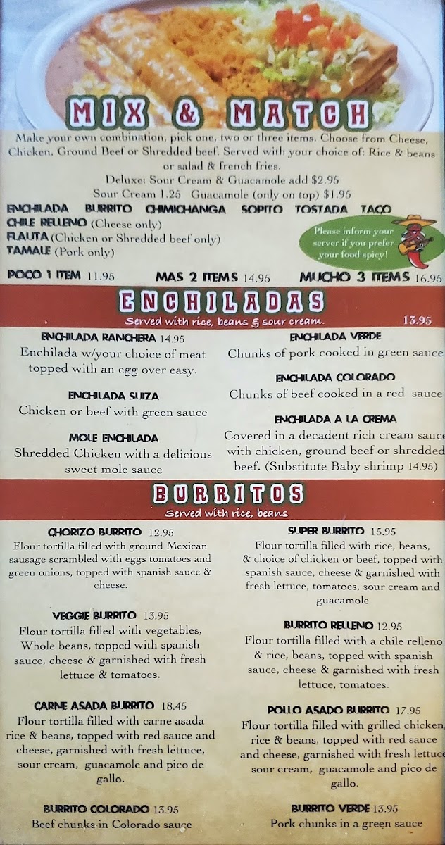 Covered in a decadent rich cream sauce with chicken, ground beef or shredded beef. (Substitute Baby shrimp 16.25). Served with rice, beans & sour cream.