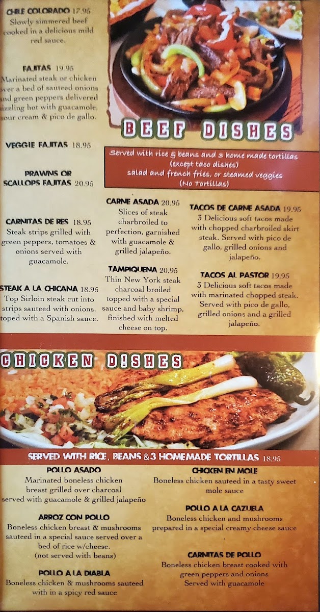 Boneless chicken sauteed in a tasty sweet mole sauce. Served with rice, beans & 3 homemade tortillas.